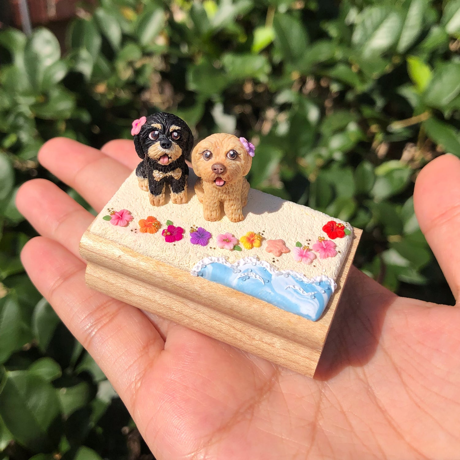 Two custom doodle pups sitting on the sandy beach, surrounded by colorful hibiscus flowers and the ocean 🐾