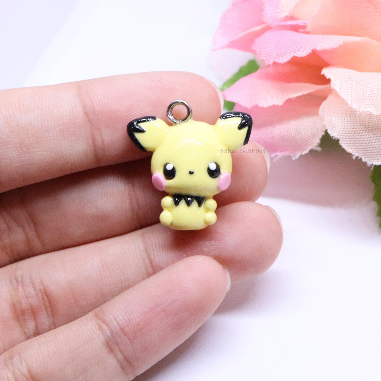 This chubby clay charm is inspired by Pichu, an Electric type Pokemon. Pichu is known to be both mischievous and playful. There's a lot of tiny details on this charm, including a little tail and pink blush.