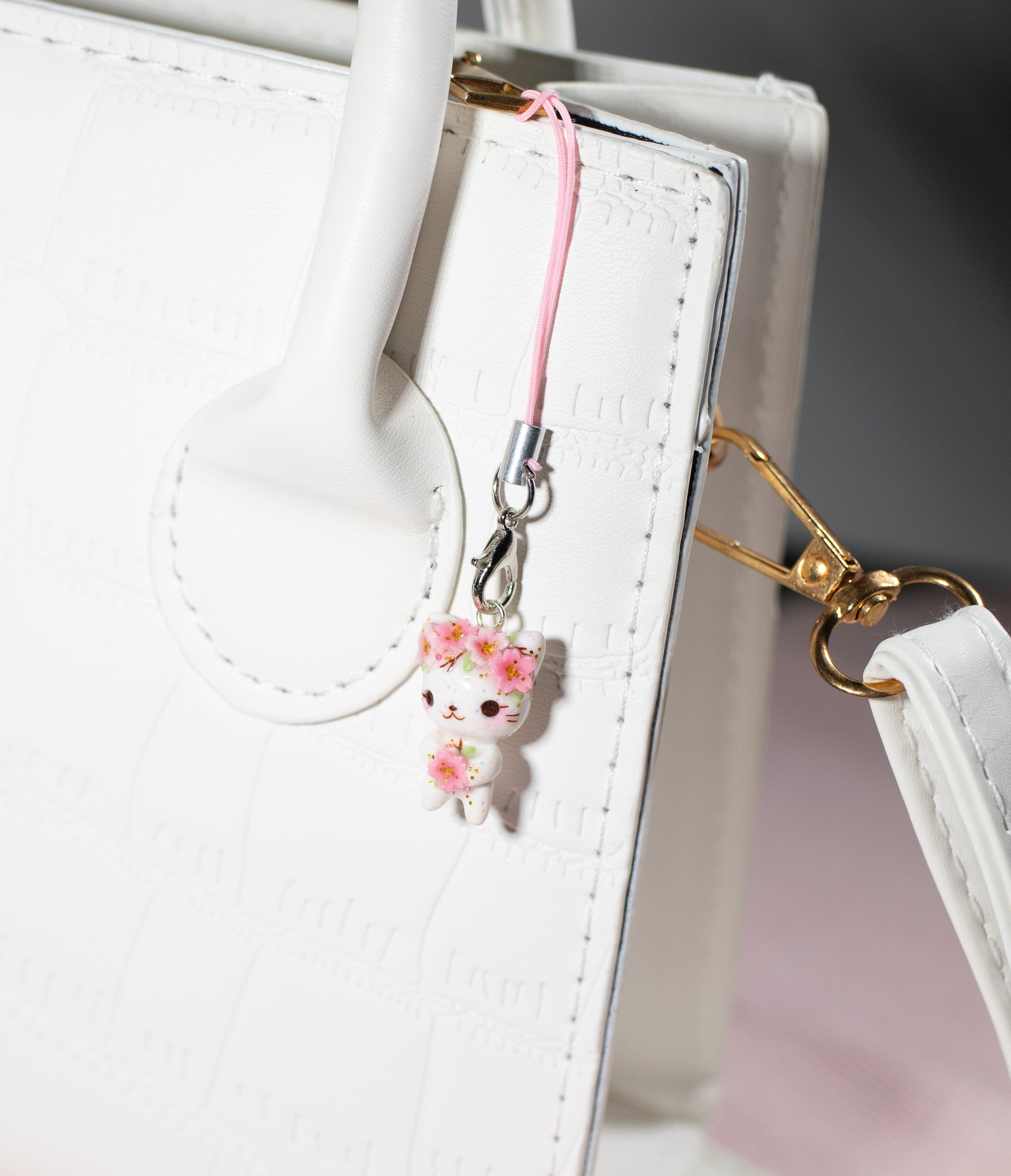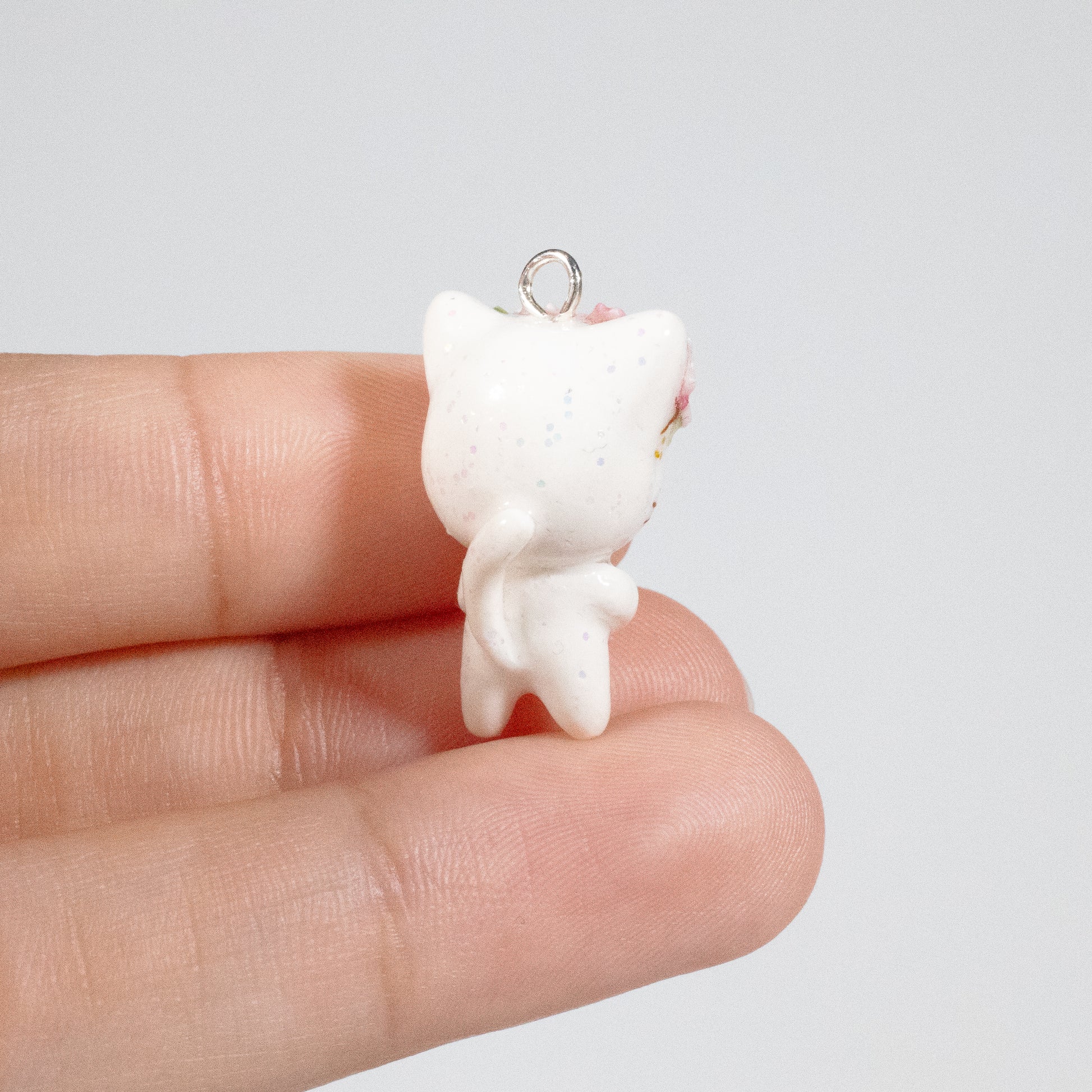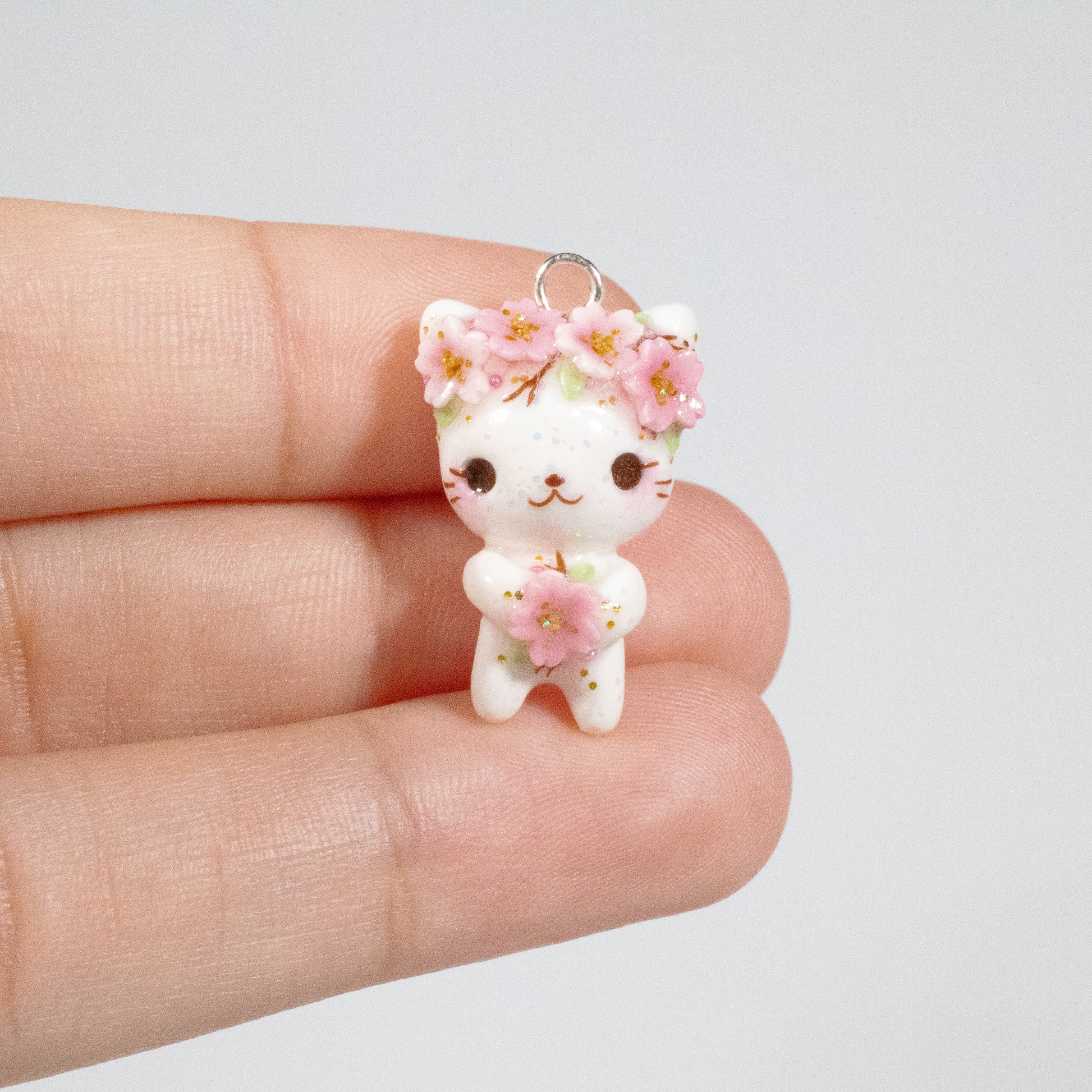 A white kitty covered in cherry blossom flowers. Chalk pastel was applied onto the pink cheeks and center of the flowers. Gold glitter was added to the middle of flowers and on the rest of the body for a little sparkly touch. The perfect size to hang from your cell phone or planner for spring time!