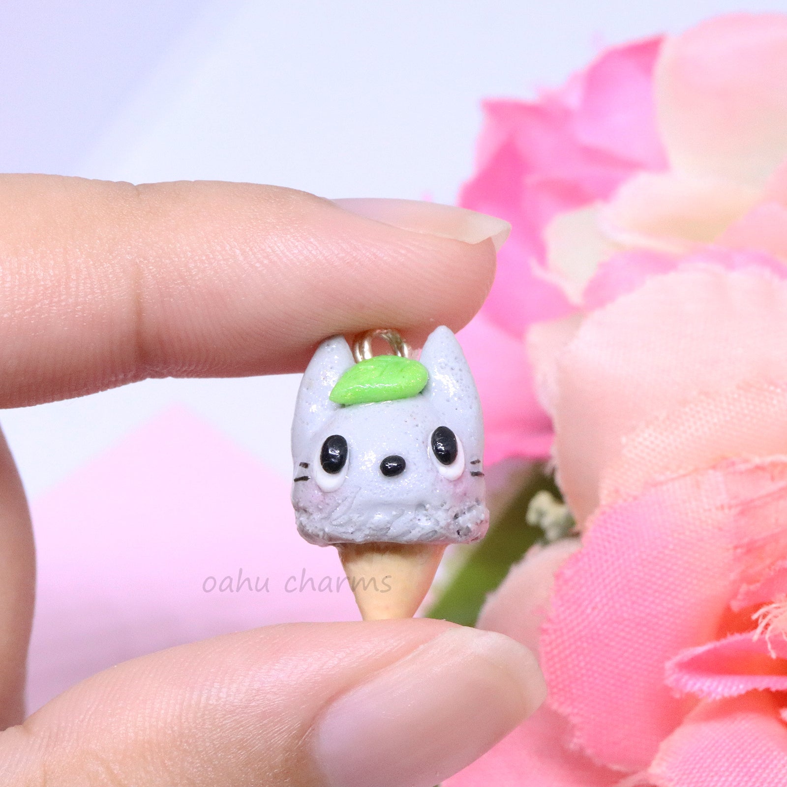 A Totoro inspired ice cream clay charm. This charm has a lot of cute, tiny details on it including small whiskers and a green leaf on it's head. The cone is shaded and textured for a realistic feel.