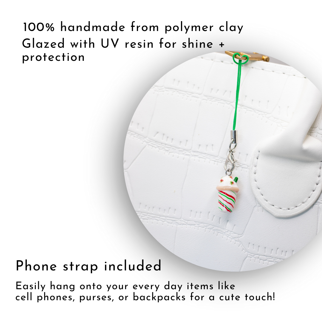 A cute, holiday frappuccino clay charm!🎄This charm has lots of tiny details on it, like sparkly glitter and tiny microbeads. There's swirls of red and green syrup to give it a Christmas look! Available as a charm or stitch marker!
