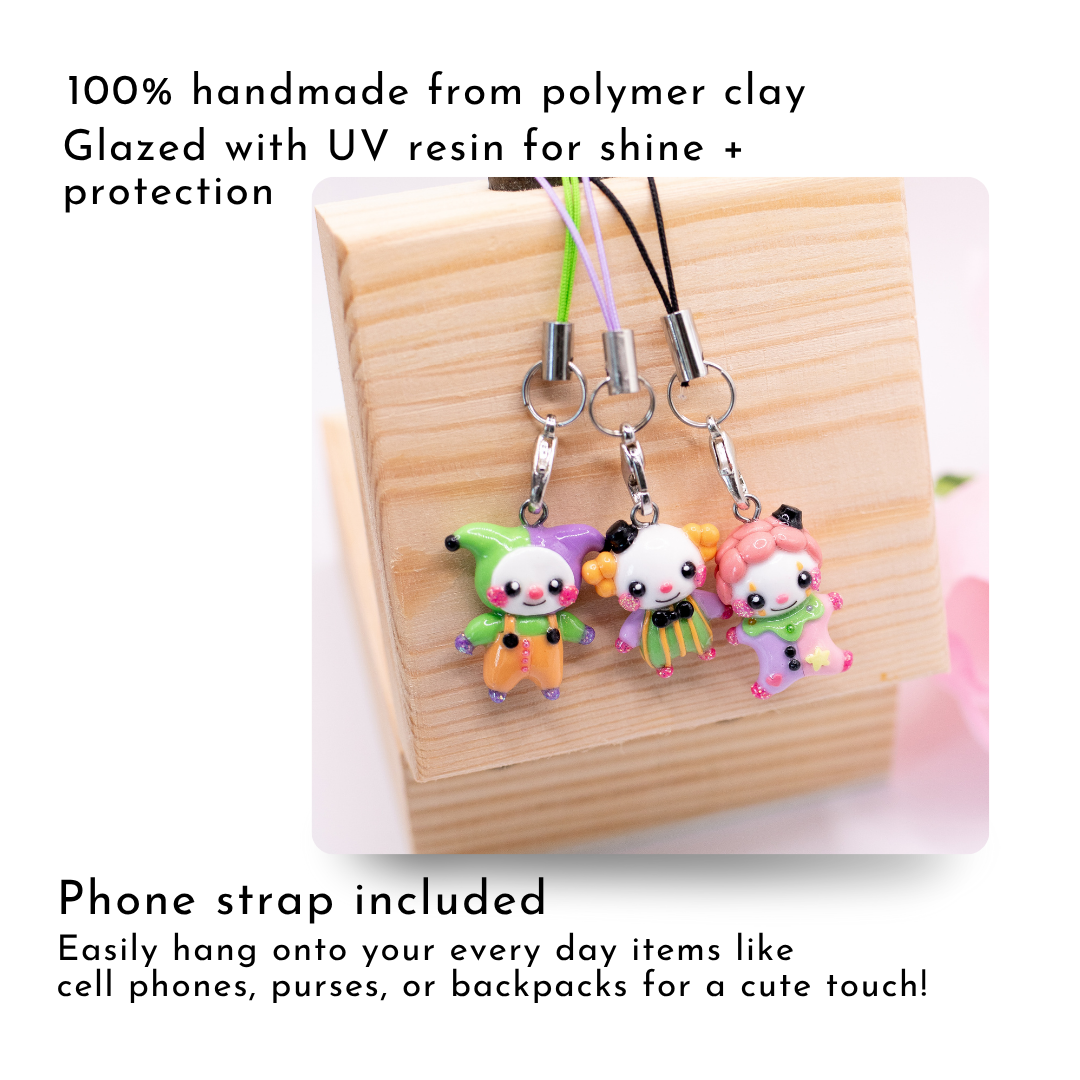 A cute h'ween clown clay charm. This little clown has a silly outfit with glittery cheeks, hands, and feet!✨ He has a smiling face with a red, button nose! He also has some button going down his overalls. The perfect little charm for the spooky season!