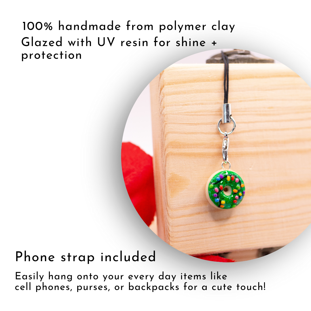 A Christmas lights donut clay charm. This charm has tiny, colorful christmas lights on it!✨The perfect accessory for the holiday season! Available as a phone charm or stitch marker!