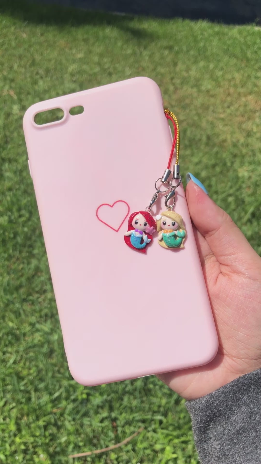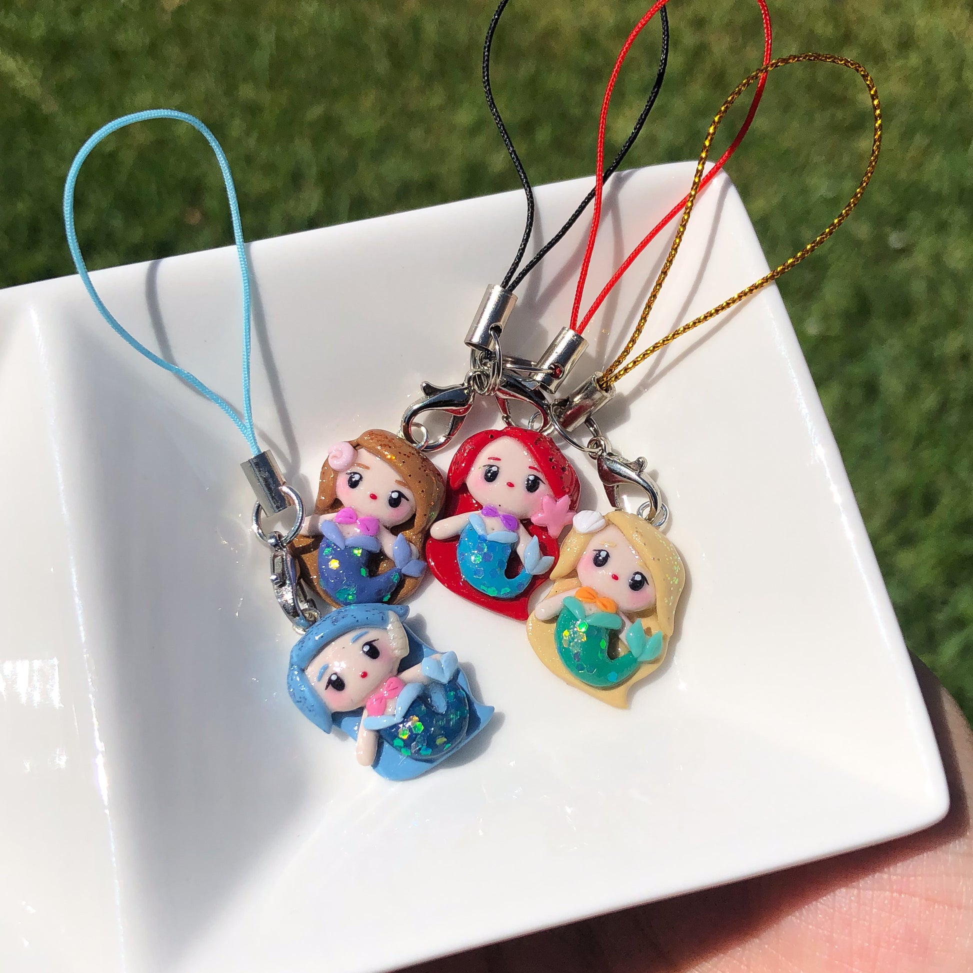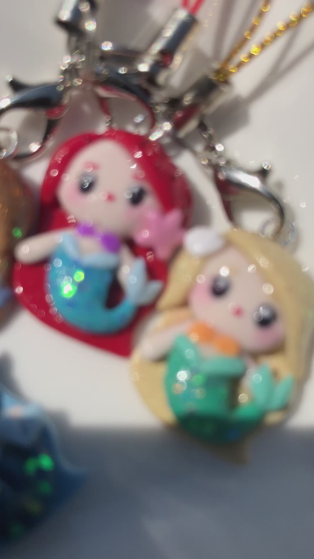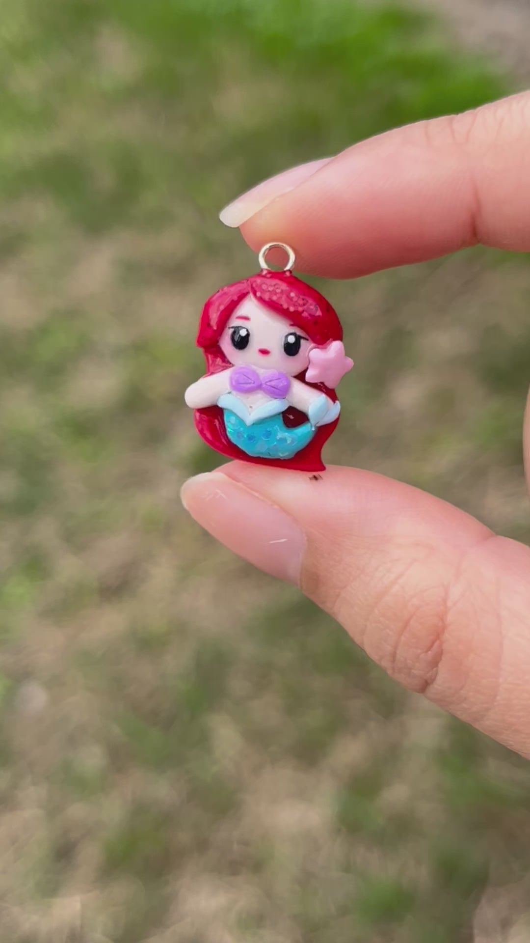 A simple, pretty mermaid clay charm. This little mermaid has a lot of tiny details on it like a glittery tail and little seashell top. Available in 4 styles: red hair, blue hair, blonde hair, or brown hair. All details are handmade from clay.