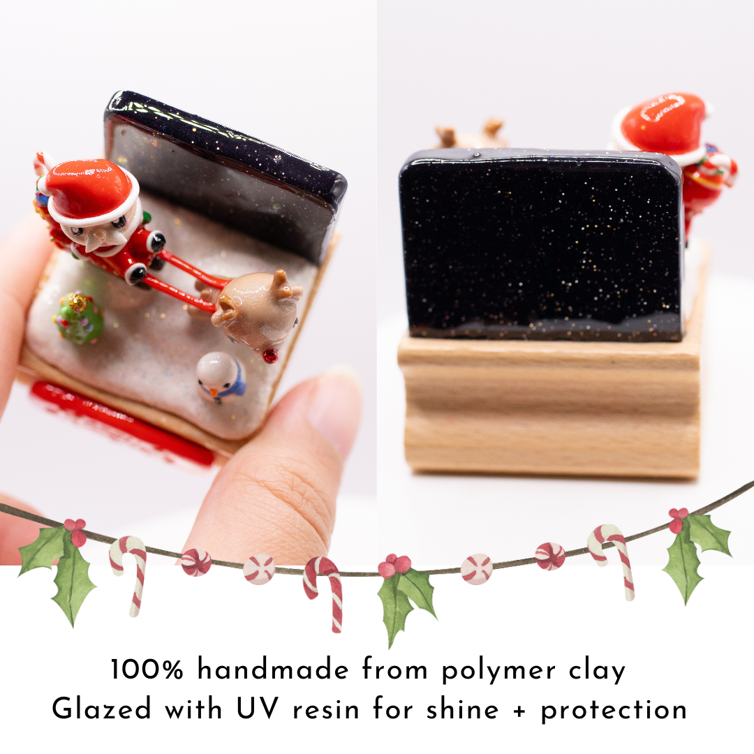 A cute, simple Santa's sleigh figurine! All details are 100% handmade and sealed with UV resin. Size: 1.6” long x 1.6" wide x 1.75” tall