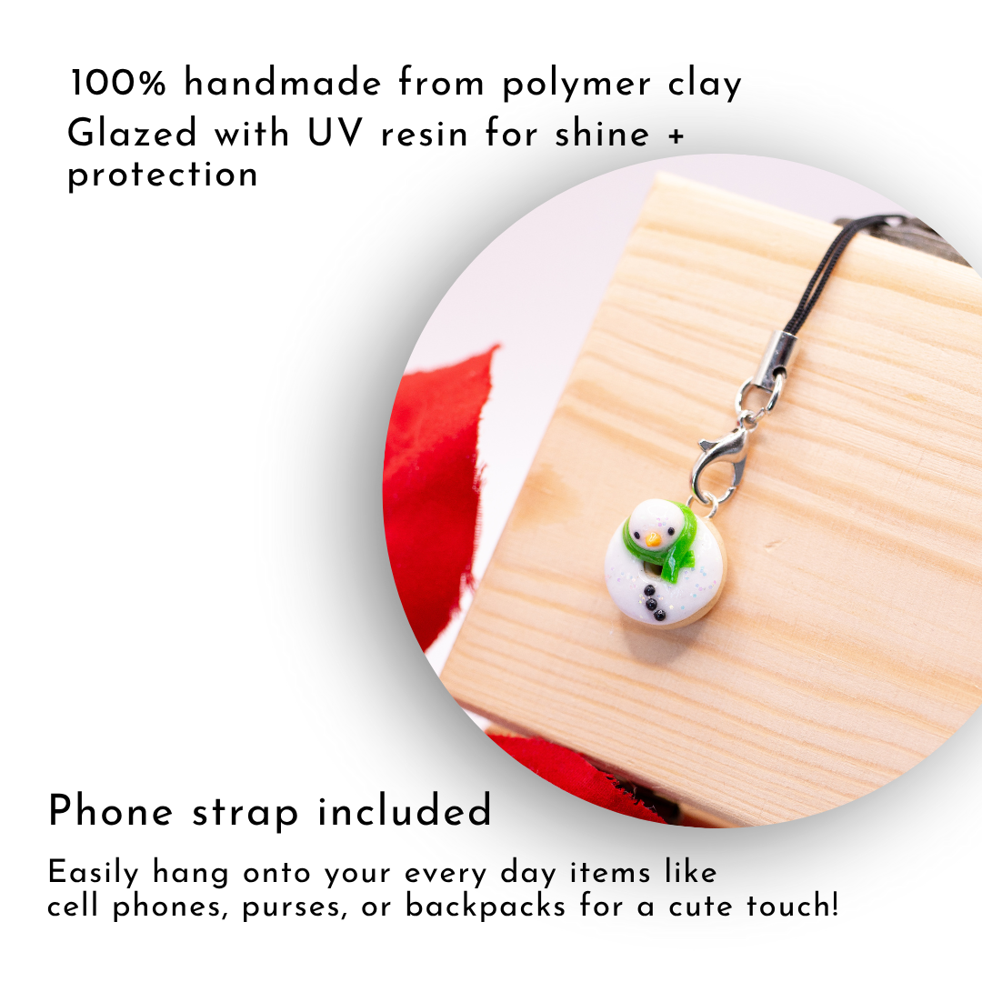 A snowman donut clay charm. This charm has a little green scarf and buttons and white glitter for a frosty look!✨The perfect accessory for the holiday season! Available as a phone charm or stitch marker!