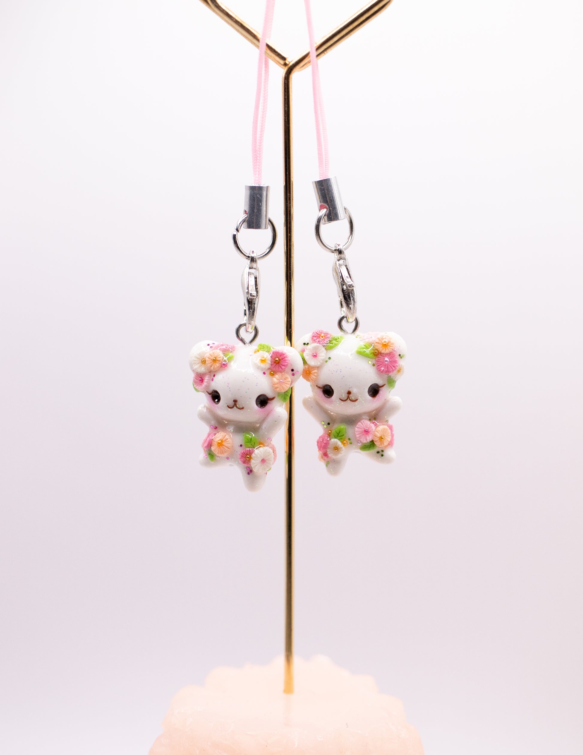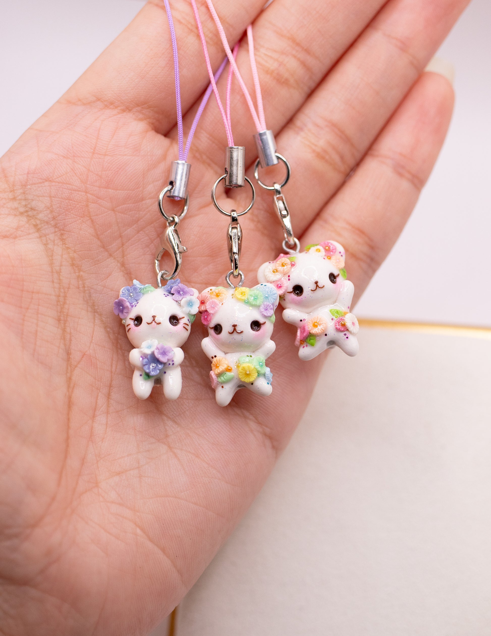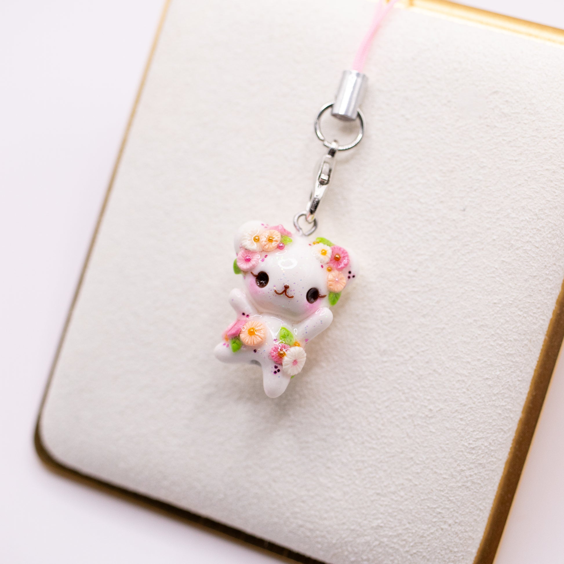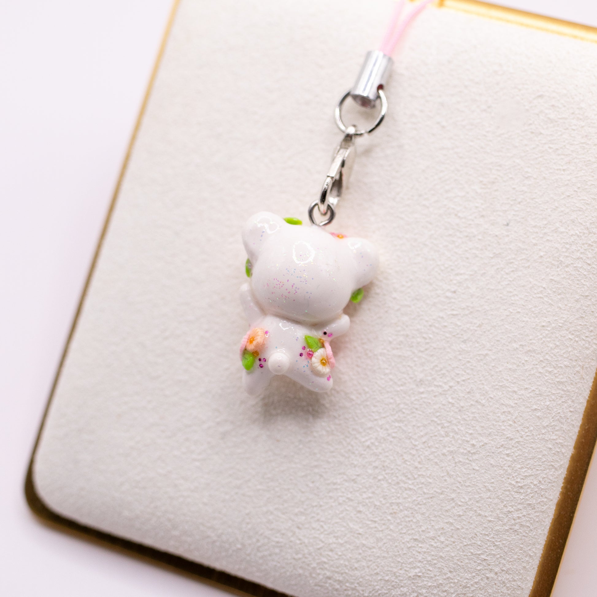 A bear charm covered in peach and pink daisy flowers 🩷 This little bear has a lot of details on her. Take a peek at the other bear variant here!🌼