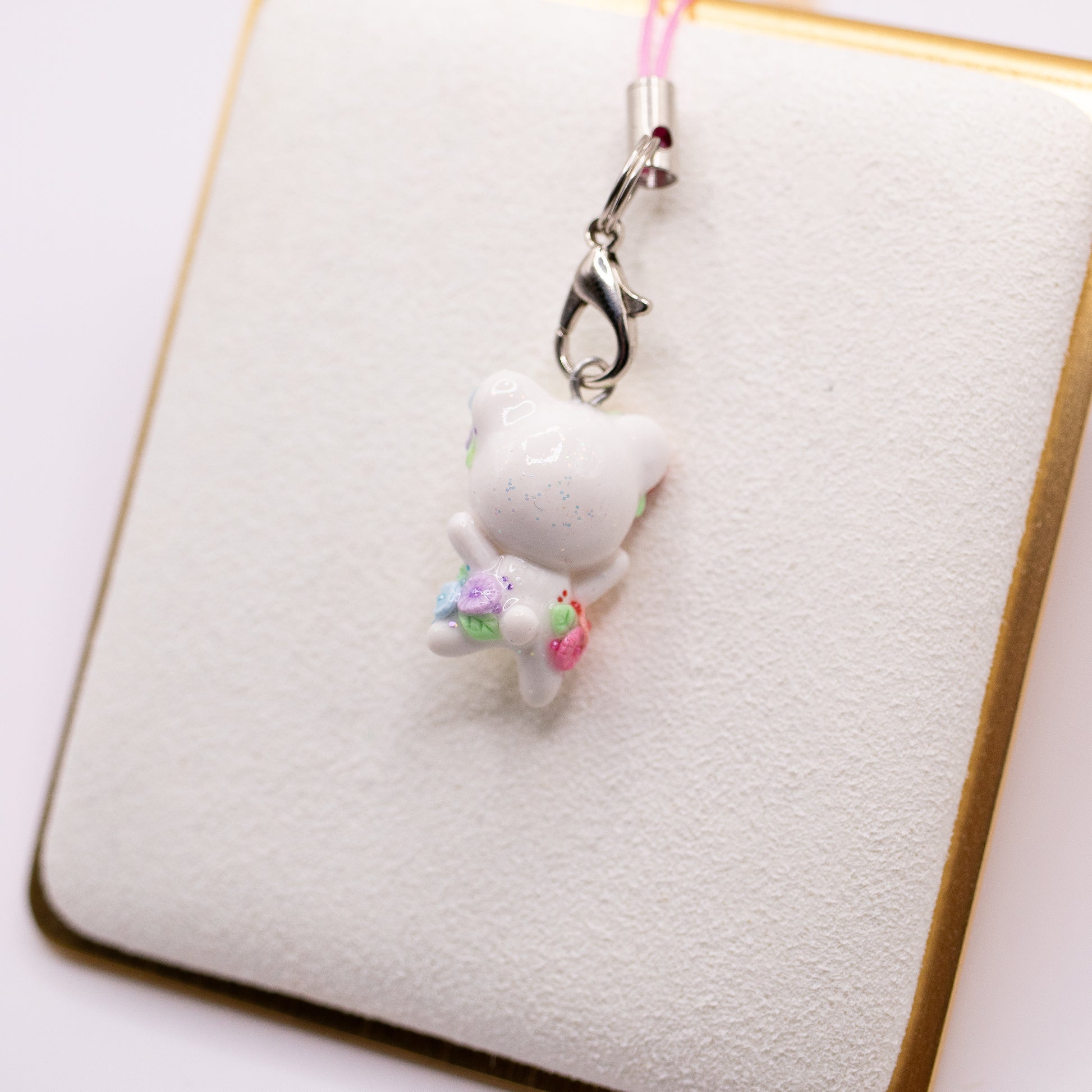 A bear charm covered in rainbow daisy flowers. 🌈 This little bear has a lot of details on her. Take a peek at the kitty variant here!