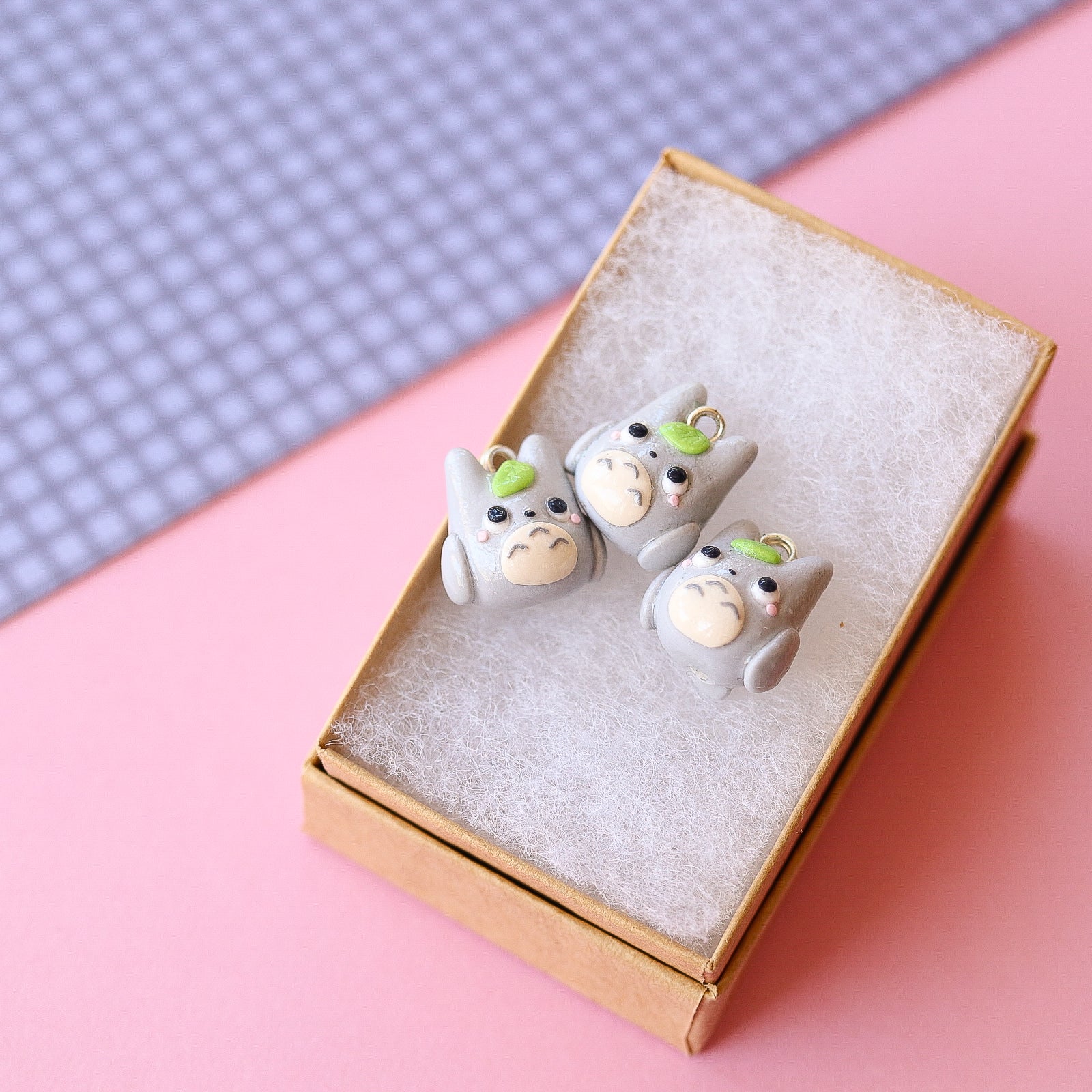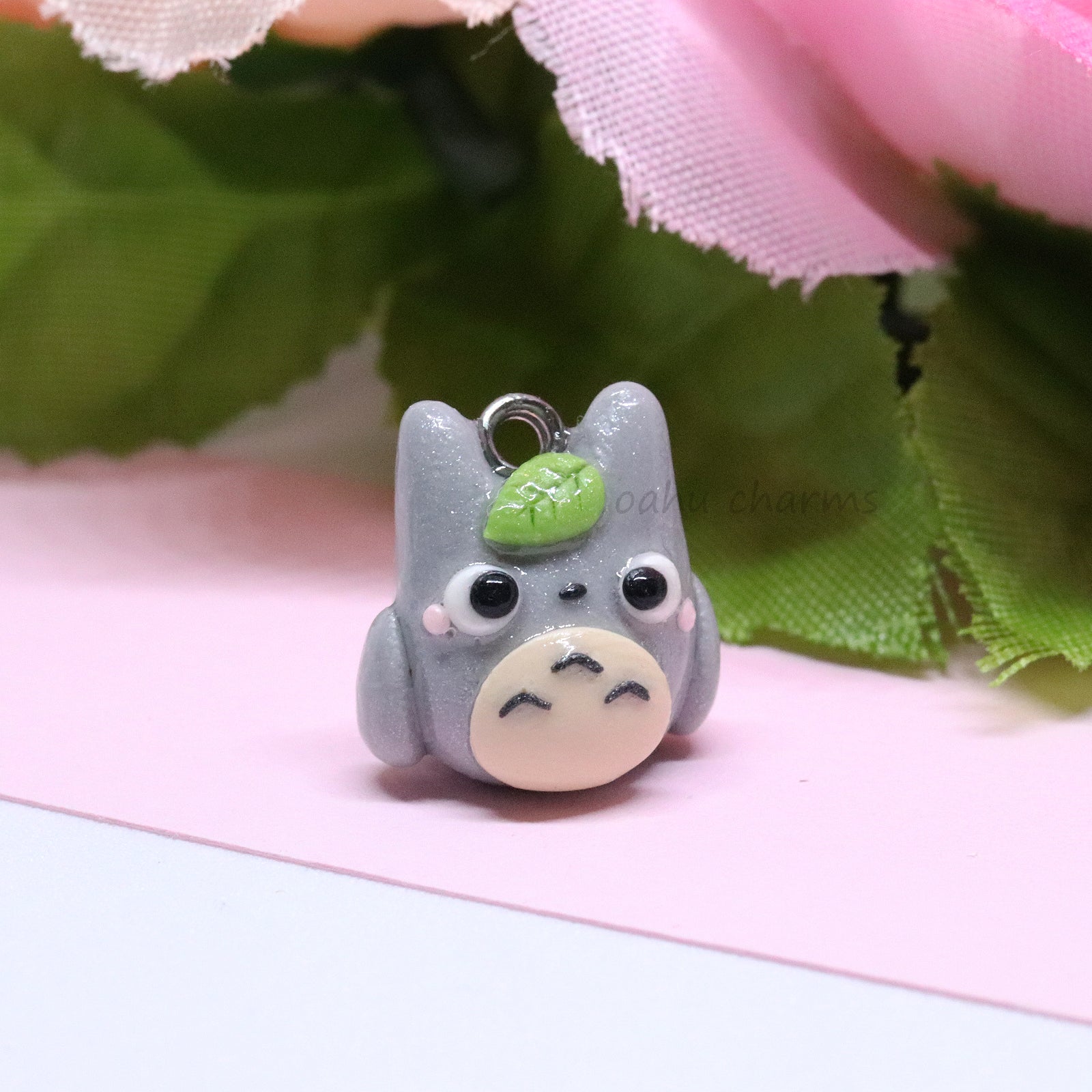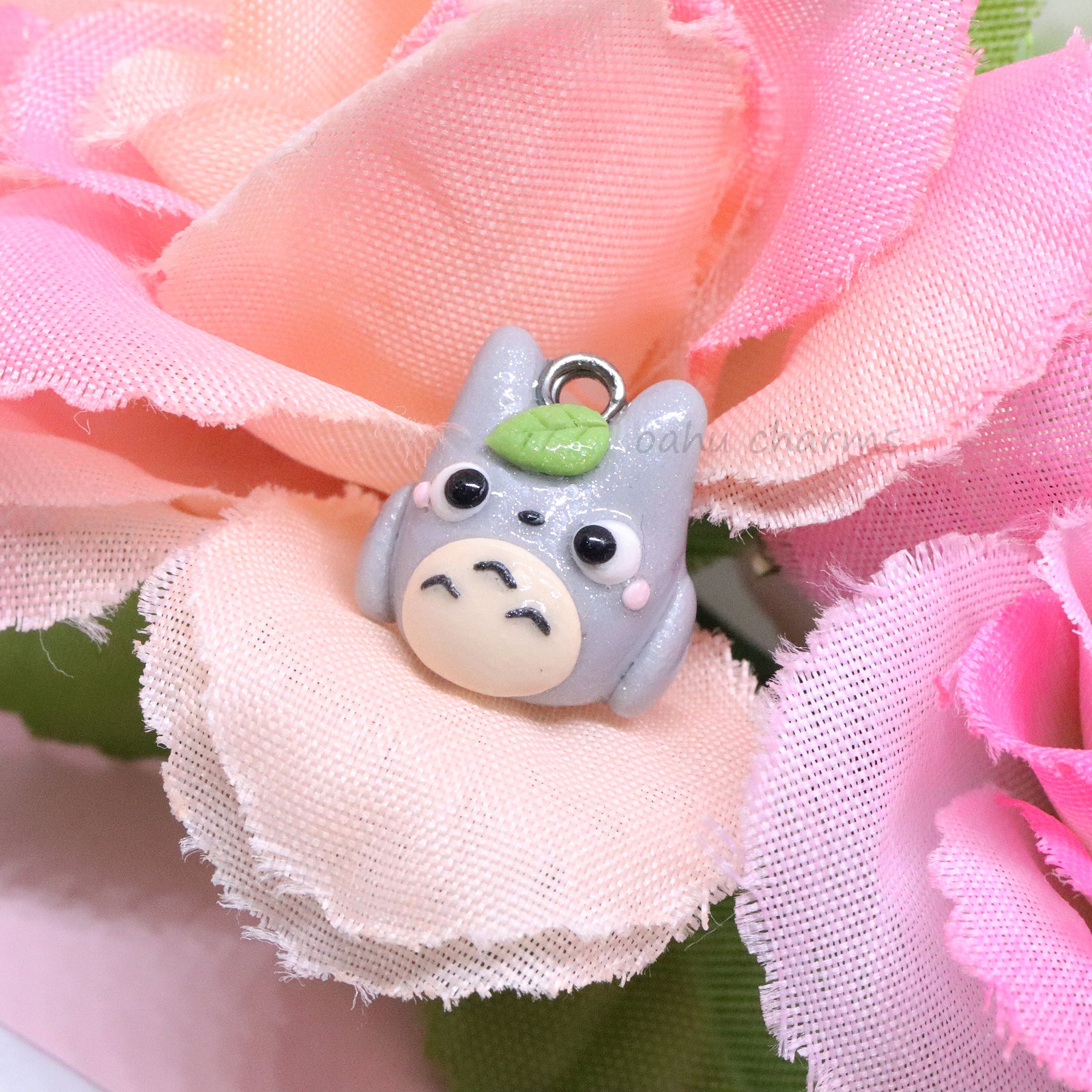 A Totoro inspired clay charm from the Studio Ghibli movie My Neighhbor Totoro. This charm has a lot of tiny details on it like round eyes and a leaf on it's head.